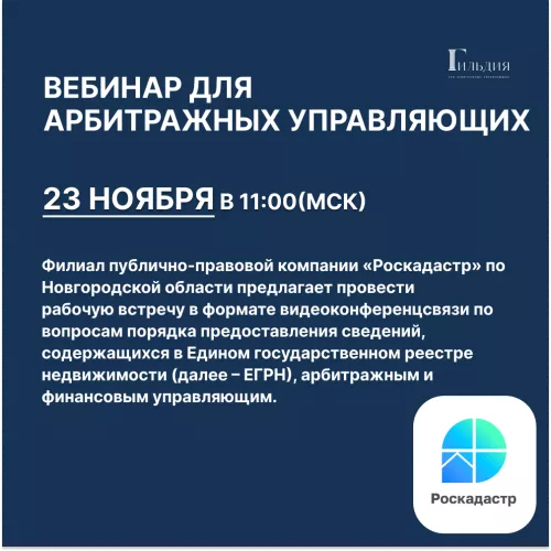 Филиал публично-правовой компании «Роскадастр» по Новгородской области предлагает провести 23.11.2023 в 11:00 (МСК) рабочую встречу в формате видеоконференцсвязи по вопросам порядка предоставления сведений, содержащихся в Едином государственном реестре недвижимости (далее – ЕГРН), арбитражным и финансовым управляющим.